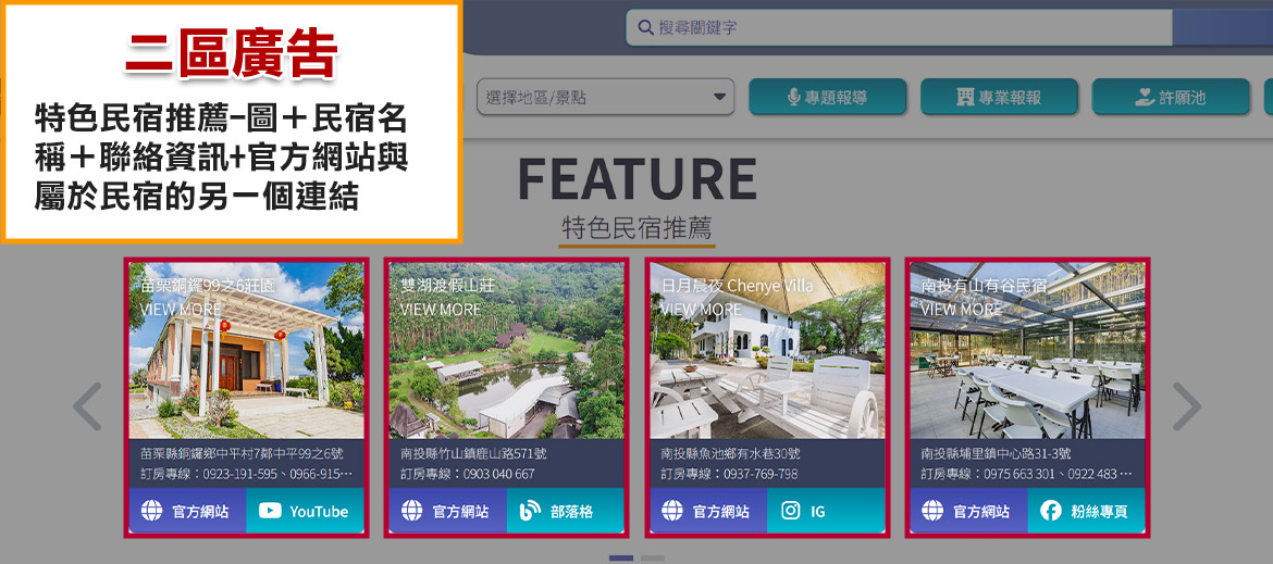 🚀 立即加入宜蘭民宿推薦王,提升您的民宿網路曝光,吸引更多旅客預訂! 想讓您的包棟民宿、親子友善住宿、寵物友善旅宿、特色Villa、海景/山景民宿、溫泉民宿在網路上被更多旅客看見嗎?宜蘭民宿推薦王提供完整的民宿資訊刊登服務,包括: ✅ 詳細民宿簡介 – 讓旅客快速了解您的特色 ✅ 客房介紹與設施 – 提供高品質住宿體驗 ✅ 房價與優惠方案 – 清楚呈現價格資訊 ✅ 套裝行程與服務 – 讓旅客一站式預訂 ✅ 住宿須知與訂房資訊 – 簡單明瞭,提升轉換率 💡 SEO優化 + 關鍵字廣告曝光 我們擁有專業的SEO搜尋引擎優化技術,透過Google關鍵字廣告,提升您的民宿排名,讓旅客更容易在網路上搜尋到您的住宿! 📢 現在就填寫廣告刊登需求表單,我們將由專人聯繫您,協助您制定最佳的網路行銷策略,讓您的民宿曝光度翻倍,訂單暴增! 廣告刊登專線:0915-900-120